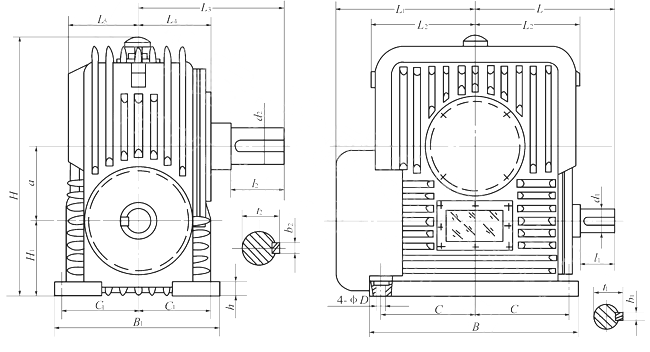 整體式PWU80、PWU100、PWU125、PWU140、PWU160、PWU180、PWU200、PWU225、PWU250、PWU280、PWU315、PWU355、型平面二次包絡(luò)環(huán)面蝸桿減速機主要尺寸(GB/T16449-1996)
