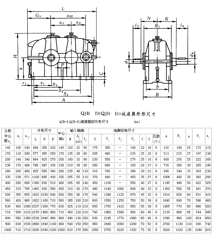 1)結構型式 QJ-D型減速器分為:QJR-D(QJB-D)型為二級,QJS-D(QJC-D)型為三級。QJRS-D(QJD-D)型為二級安裝尺寸三級速比。