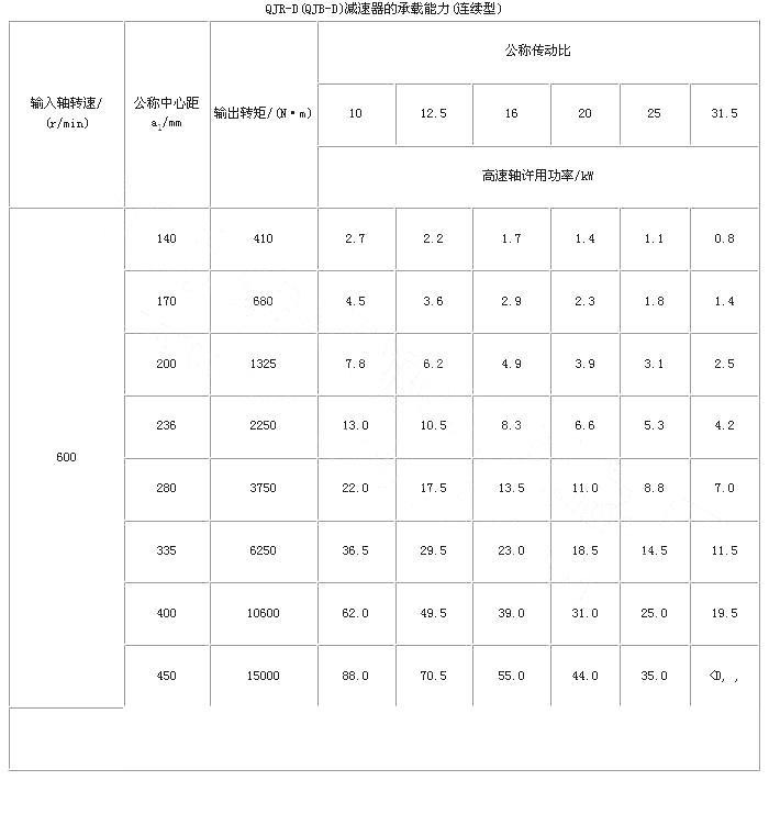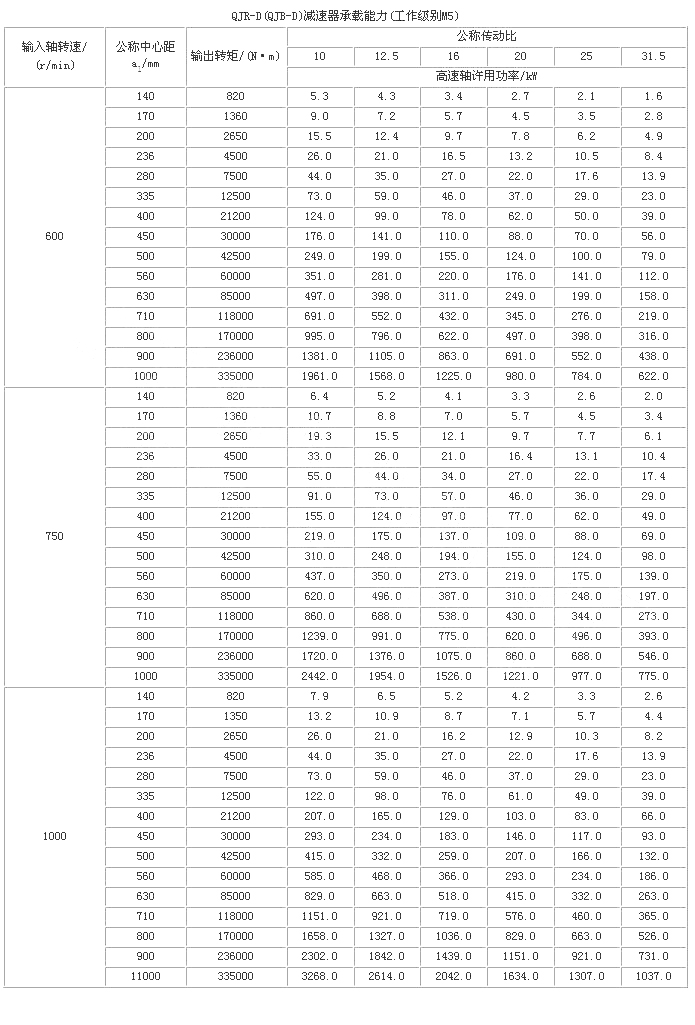 起重機底座式減速器是在三支點減速器的基礎上派生出來的。因此QJ-D型減速器的工作條件、主要技術參數(shù)、承載能力和輸出軸端最大允許徑向載荷與三支點減速器相同,其它有所不同。