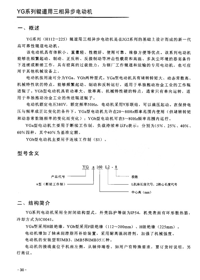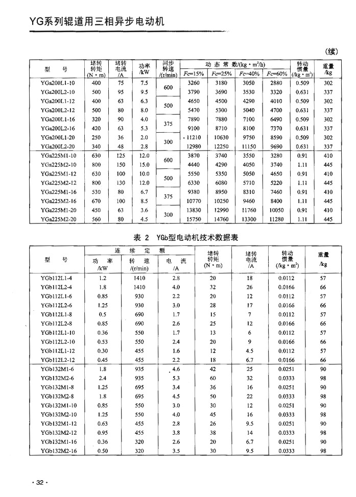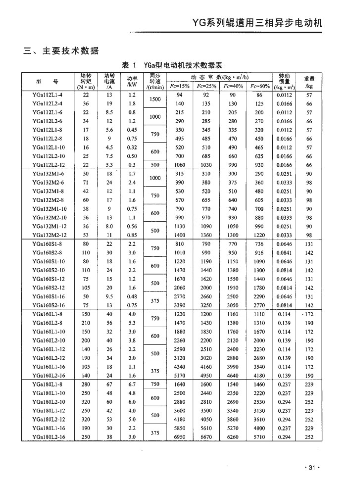 YG系列輥道用三相異步電動(dòng)機(jī)是在JG2系列的基礎(chǔ)上設(shè)計(jì)而成的新一代高可靠性輥道電動(dòng)機(jī)。該電動(dòng)機(jī)具有體積小、重量輕、性能好、使用可靠、維修方便等優(yōu)點(diǎn)。該系列電動(dòng)機(jī)能夠在頻繁啟動(dòng)、制動(dòng)、正反轉(zhuǎn)、反接制動(dòng)等沖擊性載荷和高溫、多灰塵環(huán)境的惡劣條件下連續(xù)或斷續(xù)工作,具有較高的過(guò)載能力,為鋼廠工作輥道和輸送的專用電動(dòng)機(jī),也可以應(yīng)用于其它的機(jī)械設(shè)備上。 電動(dòng)機(jī)按用途可分為YGa、YGb兩種型式。YGa型電動(dòng)機(jī)具有堵轉(zhuǎn)轉(zhuǎn)矩大、動(dòng)態(tài)常數(shù)高、機(jī)械特性軟的特點(diǎn),能頻繁啟動(dòng)、制動(dòng)和反轉(zhuǎn)運(yùn)行,適用于單獨(dú)拖動(dòng)冶金工業(yè)的工作輥道輥?zhàn)印Gb型電動(dòng)機(jī)具有功率大、效率高、機(jī)械特性硬的特點(diǎn)。通常只有單向運(yùn)轉(zhuǎn),適用于單獨(dú)拖動(dòng)冶金工業(yè)的傳送輥道輥?zhàn)印?電動(dòng)機(jī)額定電壓380V、額定頻率50Hz,電動(dòng)機(jī)采用Y形聯(lián)結(jié),可以滿壓?jiǎn)?dòng)。在保持電壓與頻率成正比變化的條件下,YGa型電動(dòng)機(jī)允許在20~80Hz頻率范圍內(nèi)使用(但堵轉(zhuǎn)轉(zhuǎn)矩和動(dòng)態(tài)常數(shù)隨頻率的變化而變化);YGb型電動(dòng)機(jī)可在5~80Hz頻率范圍內(nèi)運(yùn)行。 YGa型電動(dòng)機(jī)主要用于斷續(xù)工作制,負(fù)載持續(xù)率以Fc表示:分別為15%、25%、40%、60%四種,其中40%為基準(zhǔn)定額。 YGb型電動(dòng)機(jī)主要用于連續(xù)工作制。主要規(guī)格:YGa112、YGa132、YGa160、YGa180、YGa200、YGa225、YGb112、YGb132、YGb160、YGb200、YGb225